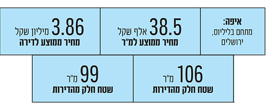 העסקה: תושב חוץ רכש שבע דירות בנות ארבעה חדרים בפרויקט "תלפיות החדשה" בירושלים תמורת 27 מיליון שקל. חלק מהדירות שנרכשו הן בשטח של כ־106 מ"ר, ומגיעות עם מרפסת, חניה ומחסן, ופונות לפארק הפנימי, וחלקן בשטח של כ־99 מ"ר. המחיר הממוצע של דירה בעסקה הגיע ל־3.86 מיליון והמחיר למ"ר הגיע לכ־38.5 אלף שקל.