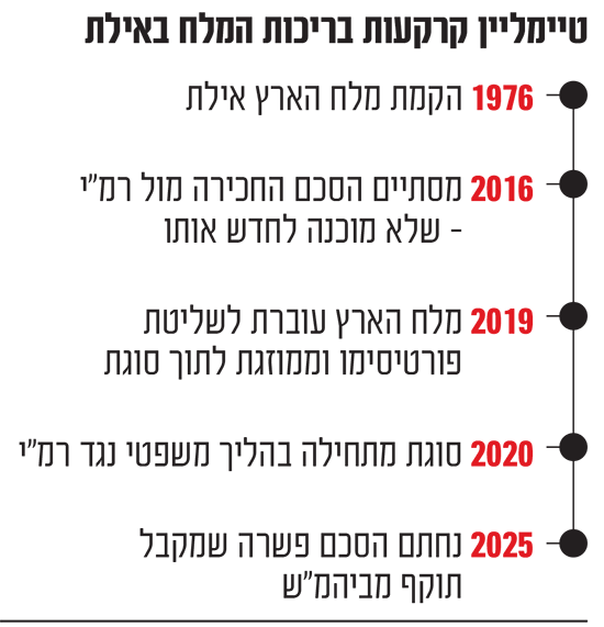 לאחר מספר שנות דיונים, הושג בספטמבר 2024 מתווה להסכם פשרה עקרוני בין הצדדים, שנה לאחר מכן אישרה אותו הנהלת רמ"י והצדדים חתמו עליו ערב הנפקת סוגת. על פי תנאי ההסכם תפנה מלח הארץ את הקרקעות שלה בעיר הדרומית, ובמקביל תחכור מרמ"י קרקע של 900 דונם בעין עברונה הממוקמת 12 קילומטרים צפונית לאילת תמורת 60 מיליון שקל.