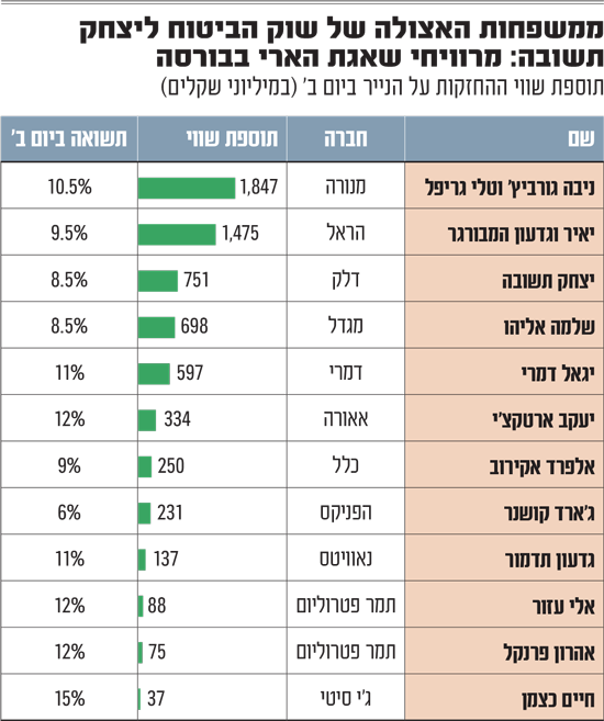 בראש מצעד המרוויחים עומדות האחיות ניבה גורביץ' וטלי גריפל, בעלות השליטה במנורה מבטחים. יחד עם ערן גריפל, בעלה של טלי ויו"ר החברה, הם מחזיקים ב-62.8% ממניות מנורה מבטחים בשווי נוכחי של 19.4 מיליארד שקל, כשלכך הצטרפו ביום ב' כ-1.85 מיליארד שקל.