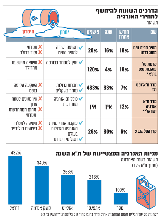 שותפויות להפקת גז ונפט, חברות הפועלות בתחום האנרגיה המתחדשת ותעודות סל על סחורות ומניות ● הדרכים שבהן ניתן לההשקיע ולהרוויח מהתייקרות מחיר הנפט ● וגם: המדד האנרגטי שהניב למשקיעים בת"א תשואה של 433% בחמש שנים - יותר מכפול מת"א 35