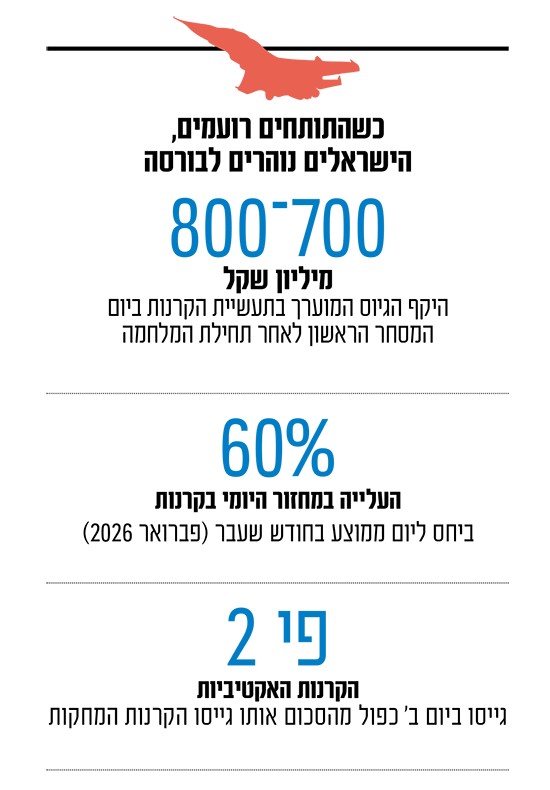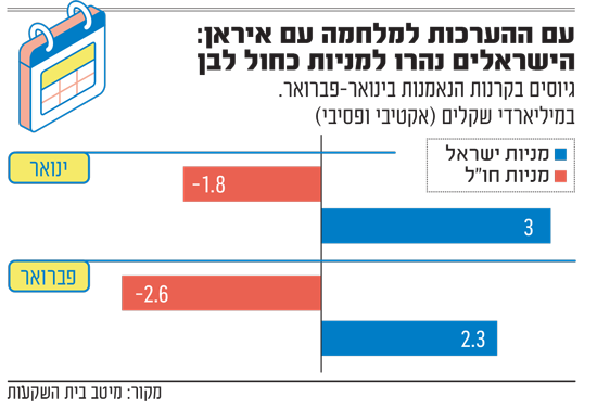 גם בכל הקשור לאופי הקרנות, הרי שהאופטימיות של המשקיעים הישראלים על שוק המניות המקומי החלה עוד לפני המערכה האחרונה מול איראן. כך, בשנת 2025 גייסו הקרנות המשקיעות במניות בבורסה בת"א כמעט 18 מיליארד שקל, בזמן שהמקבילות שלהן על מניות חו"ל גייסו כ-1.5 מיליארד שקל בלבד. מגמה זו, התעצמה בפתח השנה, כשמתחילת 2026 גייסו הקרנות על המניות המקומיות סכום של כ-5.3 מיליארד שקל, לעומת פדיונות של כ-4.4 מיליארד שקל בקרנות על מניות חו"ל.