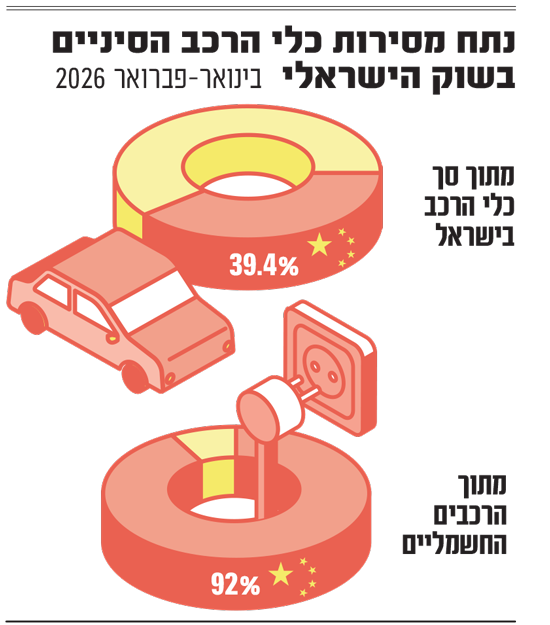תעשיית הרכב הסינית ממשיכה לחזק את אחיזתה בישראל. לפי נתוני ינואר-פברואר, שפורסמו השבוע, סך מסירות הרכב מסין הסתכמו ב-27,177 כלי רכב, עלייה של 50% לעומת התקופה המקבילה אשתקד, ונתח של 39.4% מהשוק. מסירות כלי הרכב הסיניים בינואר-פברואר אף היו גבוהות מאלו של כלי הרכב מתוצרת קוריאה הדרומית ומתוצרת יפן ביחד באותה תקופה (21,454 כלי רכב). יצוין כי זהו נתח השוק הגדול ביותר של כלי רכב מתוצרת סין בעולם, למעט סין ורוסיה.