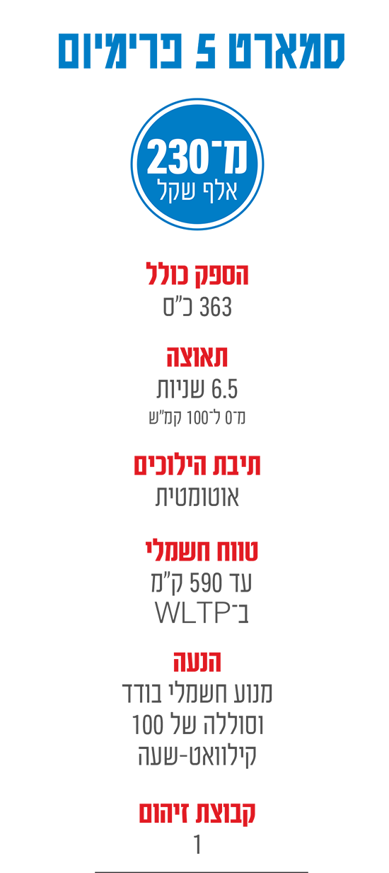 המחיר של סמארט 5 בגרסת הבסיס (סוללה של 75 קילוואט וטווח של 465 ק"מ) מתחיל כבר ב־230 אלף שקל. הדגם עם הסוללה הגדולה עולה 260 אלף שקל, והגרסה המפוארת, עם אבזור יוצא דופן, עולה 280 אלף שקל. אלה מחירים בטריטוריה של טסלה Y. כך או כך, מי שיגלה פתיחות כלפי העיצוב ימצא שהמכונית משלבת איכויות של מותג פירמיום גרמני עם מחיר "סיני", לצד החסינות בפני מחירי הדלק המטפסים. מ־0 ל־100 קמ"ש.
