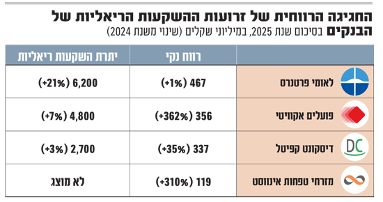 בשנתיים האחרונות, בד בבד עם הרווח הגדל של הבנקים, העלו אותן חברות השקעה הילוך בהיקף הפעילות שלהן. מהדוחות הכספיים של הבנקים לשנת 2025, עולה כי יתרת ההשקעות של שלושה מהם (לאומי, הפועלים ודיסקונט) הסתכמו ב־14.3 מיליארד שקל, עלייה של 1.6 מיליארד שקל בתוך שנה. יחד עם זרוע ההשקעות של בנק מזרחי טפחות, הן יצרו רווח נקי מצרפי של 1.3 מיליארד שקל, זינוק של 57% בתוך שנה, שנבע בעיקר מהנפקות ואקזיטים בשוק ההון.