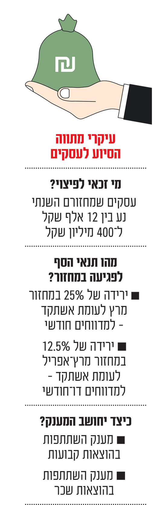 הסיוע יינתן לעסקים שמחזורם עד 400 מיליון שקל ושנפגעו בלפחות 25%, ויכלול מענקים להוצאות קבועות ולהוצאות שכר לצד מודל חל"ת לעובדים ● במשרד האוצר מדגישים כי מדובר במודל שכבר הופעל במשברים קודמים