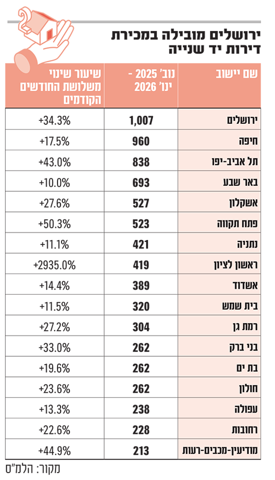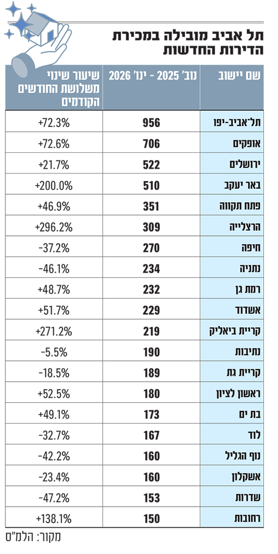 בסקירה תלת-חודשית על דירות שנמכרו בערים, עולה כי תל אביב הובילה במספר העסקאות שבוצעו בה עם 1,794 דירות, מהן 956 חדשות, גידול של 37% לעומת החודשים אוגוסט-אוקטובר 2025; אחריה הגיע ירושלים עם 1,529 עסקאות שבוצעו בה (מהן 429 דירות חדשות) - גידול של 30% לעומת 3 החודשים שקדמו. חיפה הגיעה למקום השלישי עם 1,230 דירות שנרכשו בה בנובמבר 2025-ינואר 2026 (279 חדשות), ירידה של כ-1.5% לעומת מספר העסקאות שבוצעו בשלושת החודשים שקדמו.
