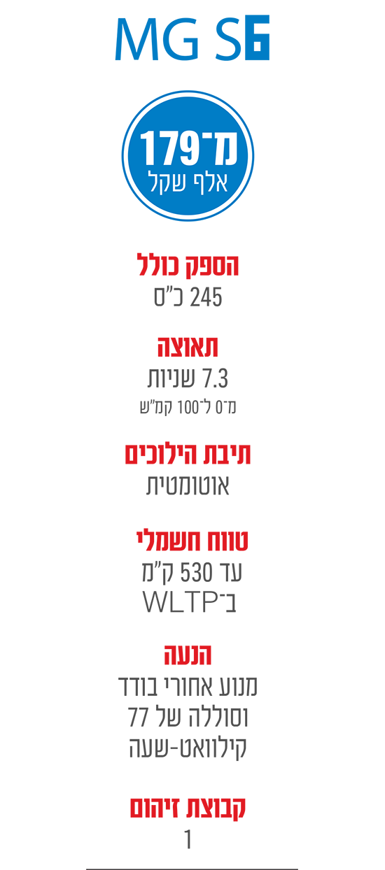 ה־MG S6 בגרסה החד־מנועית עולה כיום 179 אלף ומגיע עם אחריות מלאה לשבע שנים ועד שמונה שנים על הסוללה. הוא מציע תמורה מכובדת לכסף בכל הנוגע לשימושיות, טווח נסיעה גבוה מהממוצע בפלח המחיר הזה ואבזור תקני. אבל הוא צריך גם להתמודד בסביבה רוויה באיומים תחרותיים מצד דגמים חשמליים סיניים לצד גדודים של רכבי פלאג־אין והייבריד. אתגר לא פשוט.