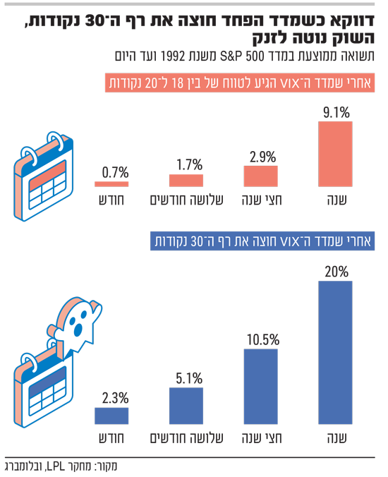"מפחיד? החדשות הטובות הן שמאז 1992 מדד S&P 500 הניב בממוצע תשואה של 20% שנה אחרי אירועים שבהם מדד הפחד עלה מעל לרמה של 30". כתבו השבוע בחברת הביטוח הראל. הם ציטטו נתונים שהביא ריאן דטריק, אסטרטג השווקים הראשי של חברת הפיננסים Carson (קרסון). על פי הנתונים שלו, חודש אחרי שמדד הפחד קופץ מעל 30 נקודות, השוק האמריקאי מצליח לרשום עליות של 2.3%, אחרי שלושה חודשים מדובר כבר בעלייה של 5.1%, בתוך חצי שנה 10.5% וכאמור בתוך שנה לא פחות מ־20%. אז האם זינוק חד במדד הפחד בעצם מאותת על ראלי מתקרב?
