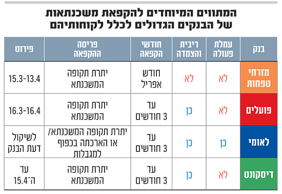 עוד היא מסבירה כי צריך לזכור שלא כל הקפאה כוללת פטור מהצמדה לריבית או למדד, ויש לקחת בחשבון שבבנקים מסוימים הלקוחות יצטרכו לשלם ריבית דה ריבית על ההקפאה.
