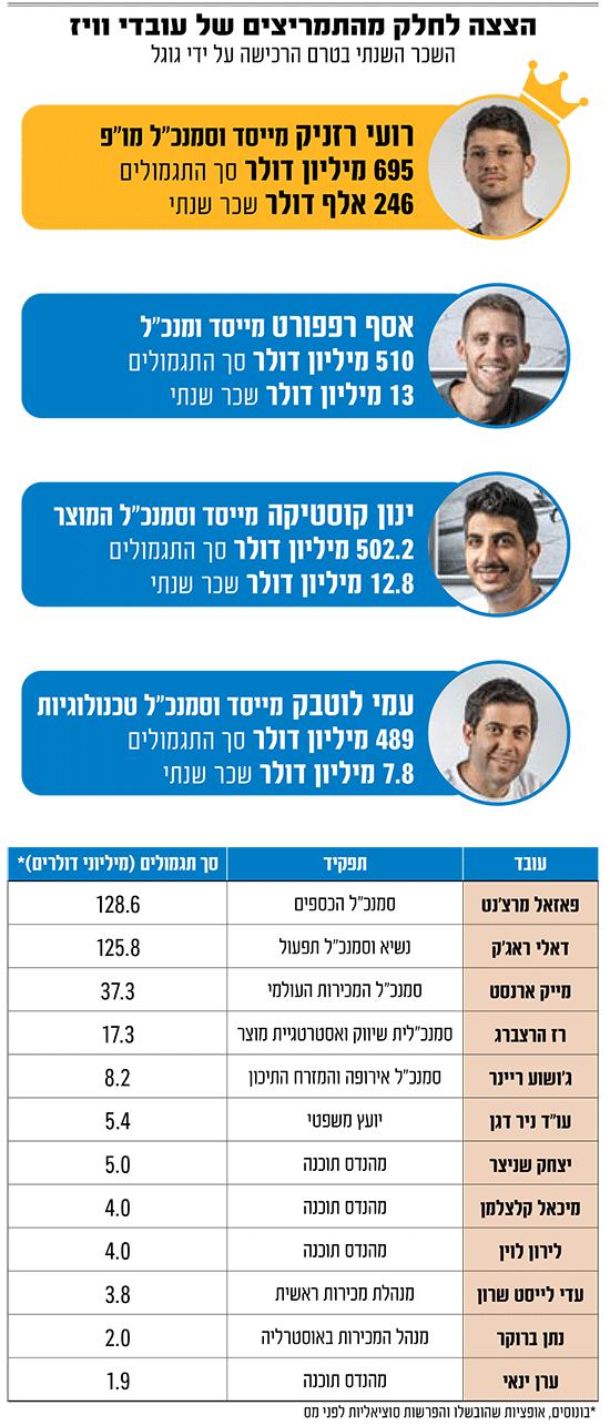בונוסים של עד מאות מיליוני דולרים למייסדי וויז ולסמנכ"לים בחברה, וארבעה מהנדסי מפתח שיתעשרו במיליונים: הרשימה של בונוסים שניתנת לעובדי וויז מתוקף מכירתה לגוגל נחשפת בגלובס לראשונה. נציין כי מדובר בהצצה חלקית לכלל התגמולים שמהם נהנים העובדים.