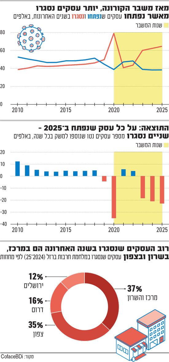 ומי שילם את המחיר הכבד ביותר? לפי נתוני חברת המידע העסקי CofaceBDi, מאז משבר הקורונה נסגרו בישראל יותר מ־300 אלף עסקים. המגמה לא השתפרה עם השנים - להפך: מאז פרוץ מלחמת חרבות ברזל ב־2023, נסגרו מדי שנה יותר עסקים מאשר נפתחו, עם גירעון נטו גדל והולך - כ־19 אלף עסקים ב־2023, כ־21.6 אלף ב־2024, וכ־23.5 אלף בשנה החולפת.