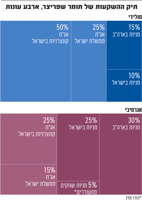 שפריצר מציע למשקיע סולידי לבנות תיק עם חשיפה של 15% למניות בארה"ב, 10% למניות בישראל, 25% לאג"ח ממשלת ישראל ו־50% לאג"ח קונצרניות בישראל במח"מ (משך חיים ממוצע) של 4־5 שנים.