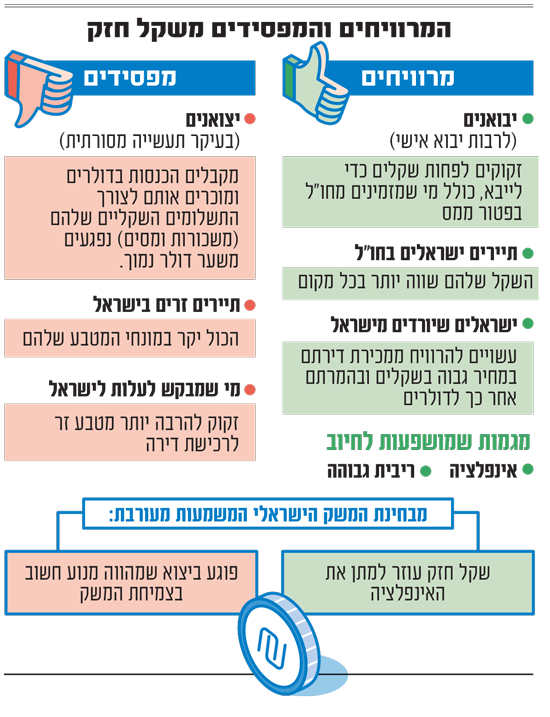 בשווקים הפיננסיים, לעוצמתו של השקל משמעות קריטית. נזכיר כי לצד המשקיעים המוסדיים בשוק המקומי פועלים גם משקיעים זרים, ואלה "גילו" לאחרונה את ישראל, והם מגבירים מאוד את פעילותם בשוק המניות והאג"ח. לצורך רכישת ניירות אלה הם ממירים דולרים לשקלים, כלומר מוכרים את הדולרים שבידיהם באופן שיוצר לחץ להיחלשות הדולר מול השקל. ברור שאם וכאשר יחליטו להוציא את כספם, הם יצטרכו לקנות דולרים, ואז ההשפעה תהיה בכיוון ההפוך. גם האקזיטים הגדולים של חברות הייטק ישראליות דוחפים בכיוון התחזקות השקל.