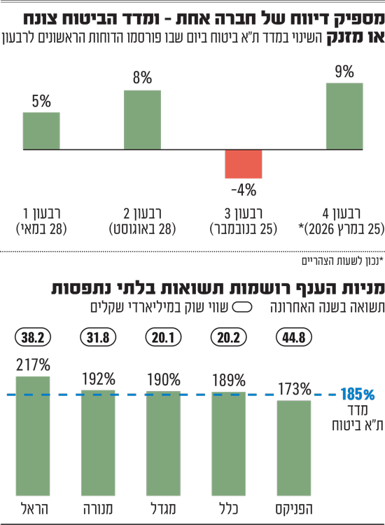 בשנה האחרונה נוסף אלמנט שבדרך כלל מתדלק עליות במניות הללו - פרסום הדוחות הכספיים. כך, ביום רביעי השבוע הייתה מגדל הראשונה מבין חברות הביטוח לפרסם את דוחותיה לשנת 2025, ולא בפעם הראשונה הגיבה להם מניית החברה בזינוק יומי, שעמד על כ־13%. בכך, סחפה את מניות יתר חברות הביטוח אחריה, כשהמדד הענפי רשם זינוק יומי של יותר מ־8%. תופעה דומה נצפתה בעקבות הדוחות שפרסמה מגדל גם במהלך בשנה החולפת.
