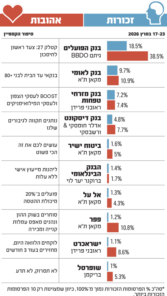המשרדים האחראים לשלוש הפרסומות האהובות ביותר הם גיתם BBDO (בנק הפועלים) ומקאן ת"א (בנק לאומי ופפר)