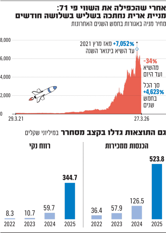 באשר למניית ארית, לאחר זינוק של אלפי אחוזים בשנים האחרונות, היא איבדה 20% מתחילת המלחמה עם איראן ונסחרת בשווי נוכחי של 4.8 מיליארד שקל. בסך הכול איבדה החברה כ-34% משווייה מהשיא של סוף ינואר (כ-2.5 מיליארד שקל).
