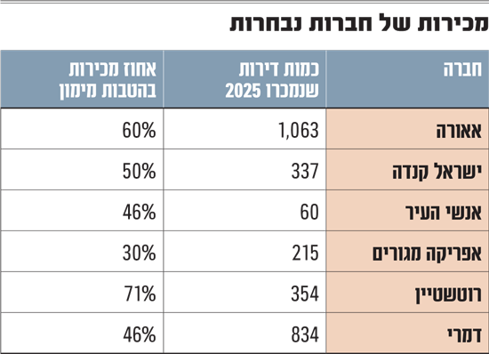"אאורה למשל מצליחה לשמור על רמת פעילות גבוהה מאוד עם מכירה של כ־1,036 דירות ב־2025, כמעט ללא שינוי לעומת השנה הקודמת. אבל כשמסתכלים לעומק רוב המכירות הללו נתמכות במבצעי מימון, ולא בביקוש 'טבעי'. בישראל קנדה התמונה הפוכה: החברה מכרה כ־337 דירות בלבד ב־2025, ירידה לעומת השנה הקודמת, אך במחיר ממוצע גבוה במיוחד של כ־6.2 מיליון שקל לדירה, מה שמדגיש את ההתמקדות בפרויקטי יוקרה".