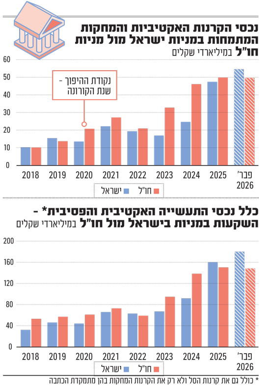 אם כוללים גם את קרנות הסל (ולא רק המחקות), התמונה היא עוד יותר חדה ומובהקת: כניסה של 16.8 מיליארד שקל לכל סוגי הקרנות המתמחות במניות בישראל, לעומת יציאה של 3.9 מיליארד שקל מכל סוגי הקרנות המתמחות במניות בחו"ל.