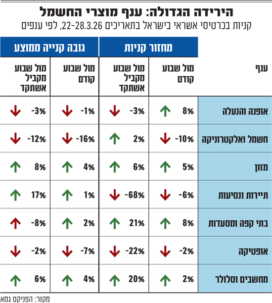 אחרי שבועיים של עליות חדות במחזורי הקניות בכרטיסי אשראי ברוב ענפי הקמעונאות, מגיע שבוע של מגמה מעורבת - המשקפת את השילוב בין היערכות לחג הפסח לבין השפעות מבצע "שאגת הארי".