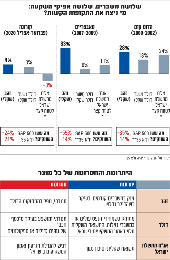בעת משבר הדוט.קום (2000־2002), הסאב־פריים (2007־2009) והקורונה (2020), הזהב עלה ב־12% בממוצע (22% במונחים שקליים). אג"ח ממשלת ישראל לטווח קצר עלה ב־11% (ו־9% במדד הכללי) ואילו הדולר טיפס אף הוא ב־9% בממוצע (מדד ה־DXY עלה בכ־6%).