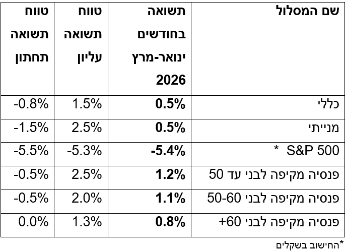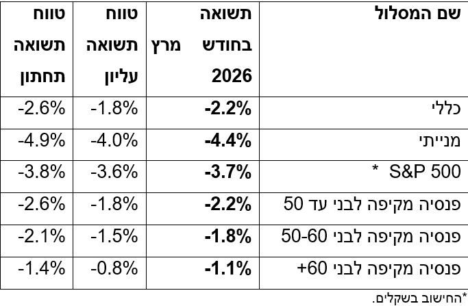 הירידות החדות של מרץ מחקו את רוב התשואה מתחילת השנה, אך לא את כולה. כך, מתחילת השנה, בשלושת החודשים ינואר-מרץ, החוסכים עדיין צפויים לראות תשואה חיובית של 0.5% הן במסלולים הכלליים והן במסלולי המניות. אלא שטווח התשואות רחב במיוחד, מעליות של 1.5% עד ירידות של 0.8% במסלולים הכלליים ומעליה של 2.5% עד ירידה של 1.5% במסלולי המניות. מנגד, החוסכים במסלולי ה-S&P 500 ממשיכים להסתכל באכזבה על התשואות עם ירידה חדה של 5.4%.