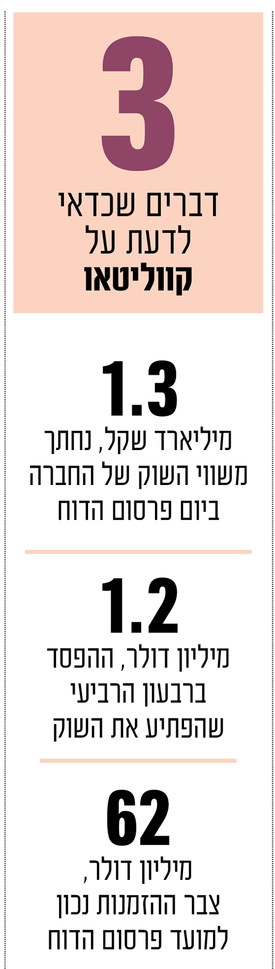 הבעת אמון התקבלה גם מבית ההשקעות מיטב, שניצל את הירידות והפך בשבוע שעבר לבעל עניין עם החזקה של 5.8% מהמניות (תמורת כ־49 מיליון שקל). במקביל, קווליטאו פעלה אקטיבית לעצירת הסחף והודיעה עם פרסום הדוח על רכישה עצמית (Buyback) בסך כ־6.25 מיליון שקל, שהוכפלה במהירות ללמעלה מ־14 מיליון שקל.