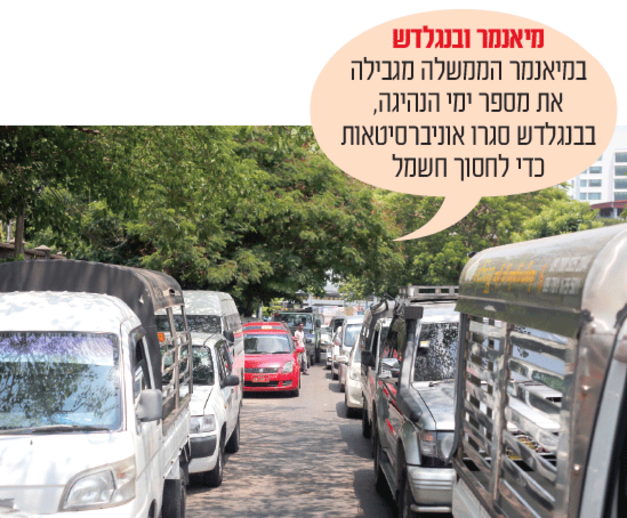 במיאנמר הולכים עוד צעד קדימה: שם חלה איסור נהיגה לפי ימים, בהתאם לספרה האחרונה במספר הרישוי - זוגית או אי־זוגית. בפיליפינים הוכרז מצב חירום אנרגטי, פקידי ממשל עברו לשבוע עבודה בן 4 ימים ושירותי המעבורות צומצמו. בבנגלדש סגרו אוניברסיטאות לחופשה מוקדמת כדי לחסוך חשמל, והחשכות הפכו לחלק מהשגרה.