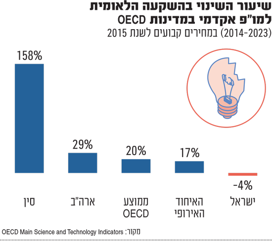 לפי דוח האקדמיה הלאומית למדעים, שפורסם בפברואר השנה, ההשקעה הלאומית במו"פ אקדמי בישראל היא הנמוכה ביותר ב־OECD ועמדה ב־2023 על כ־1.56 מיליארד דולר. מדובר בירידה ביחס לשנים קודמות, ולמעשה היא דומה להוצאה ב־2013. במחירים מנורמלים, ההשקעה ירדה בעשור שהסתיים ב־2023 בשיעור של כ־,4% בעוד שבמדינות OECD נרשמה בממוצע עלייה של כ־20%.