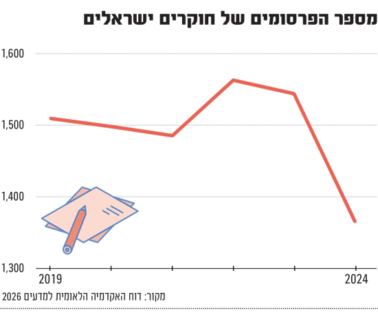 בדוח מצב המדע של האקדמיה הלאומית למדעים, שפורסם בפברואר השנה, הוצג גרף שמראה את הירידה הדרמטית במספר הפרסומים של חוקרים ישראלים. הנתונים, שהיו מעודכנים ל־2022, הראו ירידה ממקום 20 ל־37 בפרסומים מדעיים לנפש. הם מעידים על מגמה ארוכת טווח, וזאת עוד לפני שהם מגלמים את השפעות המלחמה.