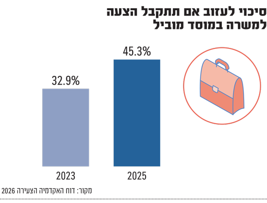 בסקר האחרון ניכרת עלייה במספר החוקרים שמוכנים לעזוב, אם כי עדיין הרוב אינם מעוניינים בכך. הנטייה לעזוב גבוהה יותר בקרב צעירים מבטיחים ללא קביעות שיכולים לקבל הצעות ממוסדות מובילים. הכוונות לעזוב אינן בגדר כוונה בלבד, כפי שהראה מחקר של פרופ' איתי אטר, פרופ' ניתאי ברגמן ודורון זמיר מאוניברסיטת ת"א, שבחן את יחס ההגירה של משכילים.