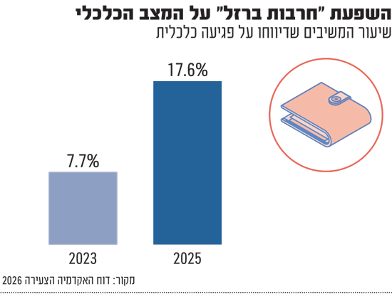 אחד הנתונים שבהם בולט השינוי לרעה בין 2023 ל־2025 הוא המצב הכלכלי של הנסקרים. ב־2023, כ־7.7% דיווחו שהמלחמה פוגעת במצבם הכלכלי, ואילו ב־2025 שיעורם זינק ל־17.6%. באופן לא מפתיע, לדרגה ולקביעות הייתה השפעה מובהקת. מרצים בדרגות פחות בכירות לפעמים משלימים שכר בעבודות פרילאנס כמו הרצאות, שחלקן נעלמו במלחמה. במקביל, היה להם קשה יותר לקבל תקנים מלאים או חלקי משרה.