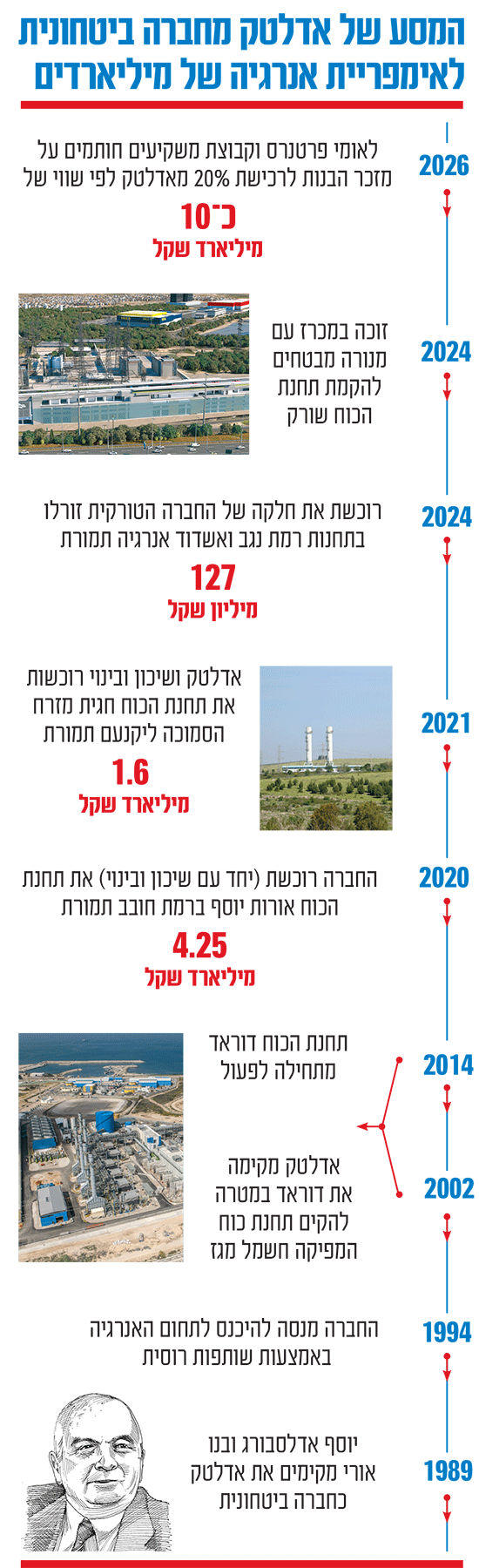 אורי אדלסבורג הפך לפני כ־30 שנה חברה שעוסקת בתיווך עסקאות ביטחוניות לחברת אנרגיה ● במשך השנים הוא אסף תחנות כוח בישראל, עד שהגיע לאחיזה ב־5 תחנות שאחראיות על 20% מייצור החשמל המקומי ● כעת, עסקה עם לאומי פרטנרס משקפת לו שווי של 10 מיליארד שקל ומטילה זרקור על אחד מאנשי העסקים המסתוריים והחזקים בישראל