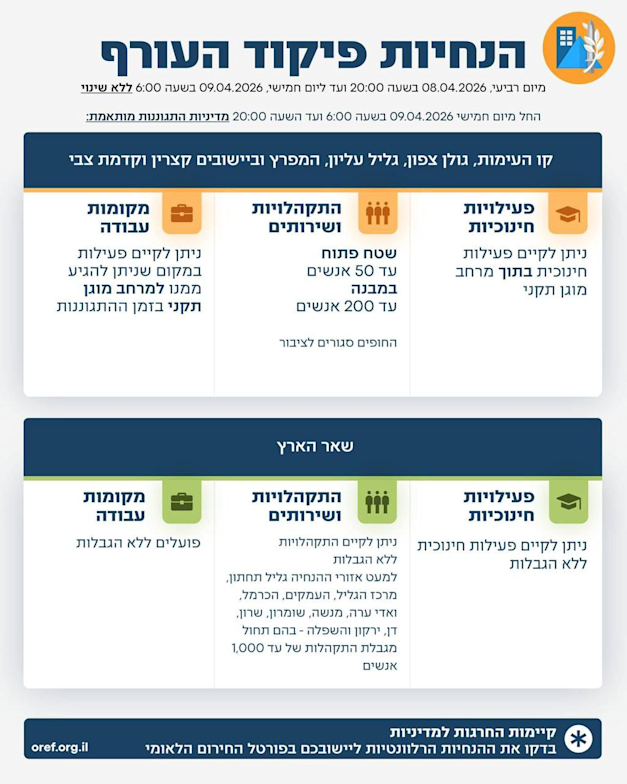 הסכם הפסקת האש בין ארה"ב לאיראן הובילה להחלטת פיקוד העורף כי רוב האזורים יהפכו לירוקים, מלבד בצפון הארץ ● האם תהיינה הגבלות על מערכת החינוך, ומהן ההקלות שייכנסו לתוקף מחר ב-06:00 בבוקר? ● גלובס עושה סדר