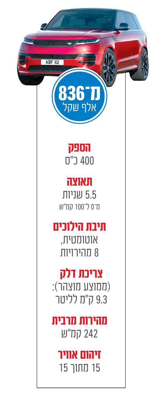 ריינג'רובר ספורט מוצע כיום בעולם ובישראל גם בכמה אופציות הנעה "ירוקות", כולל גרסת פלאג-אין פופולרית. אבל הגרסה שעומדת כאן למבחן מצוידת במנוע בנזין "קלאסי", שתוכנן במקור עבור השוק האמריקאי (ועבור מדינות המפרץ), ומגיע אלינו בזכות המכסים הגבוהים שהטיל ממשל טראמפ על יבוא רכב מבריטניה לארצות הברית.