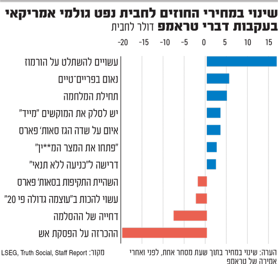 התהפוכות במלחמה מול איראן בשבועות האחרונים טלטלו את המחירים של מגוון השקעות, לא רק מתחום האנרגיה ● אבל לא פחות מהאירועים עצמם, למוצא פיו ומקלדתו של נשיא ארה"ב היה תפקיד מכריע בתנודות הללו