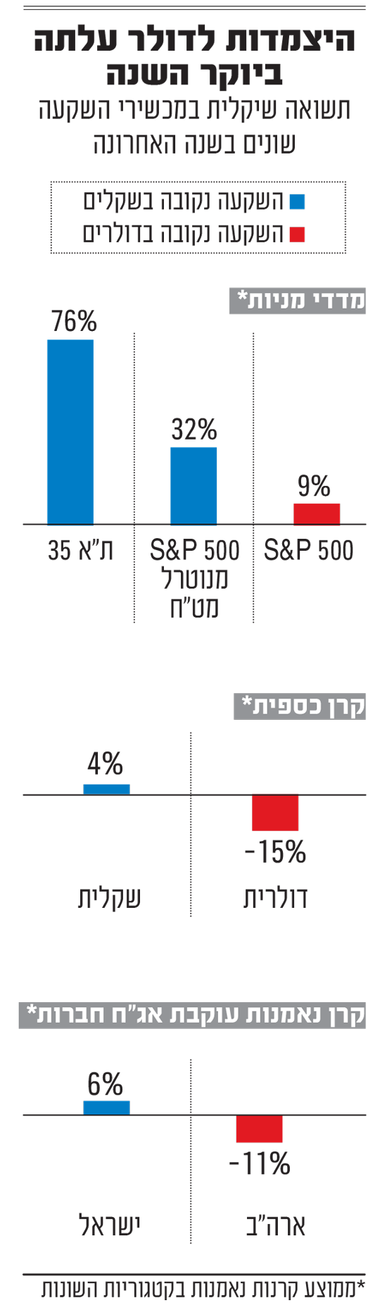 בשנה החולפת המשקיעים הישראלים שנחשפו לדולר, יכלו רק להביט בעיניים כלות כיצד נפילתו ביחס לשקל "מחסלת" להם את התשואה. קריסה של כ־20% בשער הדולר מול השקל בשנה האחרונה "אכלה" את רוב רובה של התשואה באפיקים המנייתיים והעבירה להפסדים את מי שהשקיעו באפיקים סולידיים.