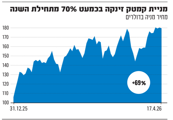 בשבוע שעבר הגיעה מניית קמטק לשיא של כל הזמנים, שממנו נחלשה מעט בסוף השבוע. החברה מספקת מערכות לבדיקת תהליכי הייצור של שבבים, והיא נסחרת במקביל בנאסד"ק ובתל אביב לפי שווי של כ-8.4 מיליארד דולר, אחרי קפיצה של 69% במניה מתחילת 2026 (ושל 628% בשלוש השנים האחרונות).