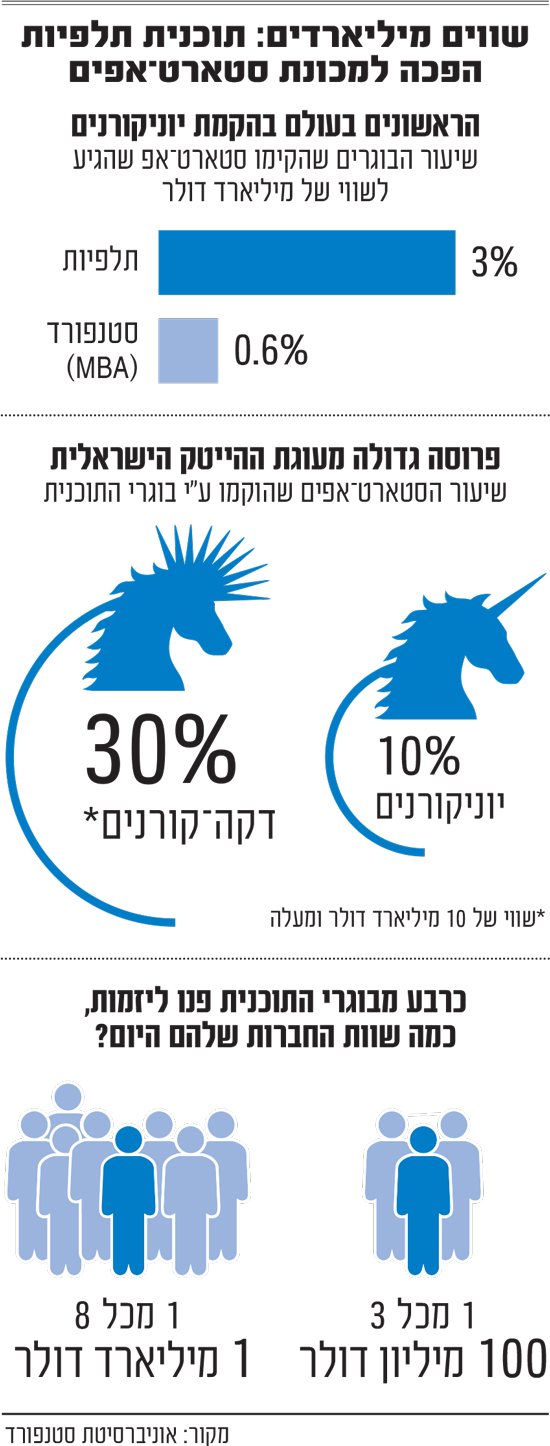מחקר שערך בוגר התוכנית עומר דורון יחד עם פרופ' איליה סטרבולייב באוניברסיטת סטנפורד, ונחשף לראשונה בגלובס, מגלה כי כעשירית מהיוניקורנים הישראליים הם תוצרים של בוגרי התוכנית. שיעור המייסדים בקרב בוגרי תלפיות הוא הגבוה בעולם - פי חמישה אפילו מתוכנית ה־MBA היוקרתית של סטנפורד עצמה.